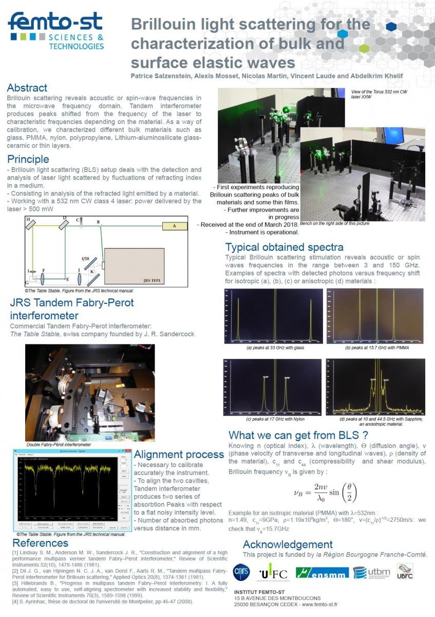 - Diffusion Brillouin: mise en place d'un banc de caractérisation de diffusion Brillouin en 2018, caractérisation de matériaux massifs ou en couches minces (voir poster). Intéressé par l'évaluation des incertitudes de mesures associée, voir un article récent sur l'incertitude de mesure sur du PMMA, en collaboration avec le laboratoire national de métrologie de Singapour.