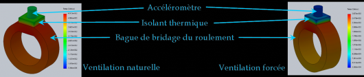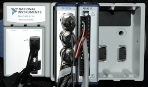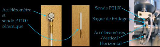 Le système d’acquisition est constitué d’un rack modulaire connecté à l’ordinateur via une liaison série USB 2.0. Ce rack intègre 3 modules qui permettent de connecter des capteurs spécifiques. Le module NI 9234 est dédié à 4 accéléromètres IEPE. Trois accéléromètres sont connectés à ce module : deux situés sur la bague de bridage du roulement, en position horizontale et verticale décalés de 90°, le dernier étant positionné sur un des paliers du dispositif. Le module NI 9217 accueille le capteur de température, une sonde céramique PT100 connectée en montage 4 points. |