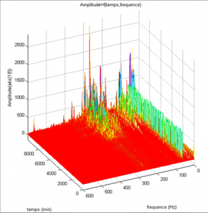 La représentation 3D ci-jointe est un exemple de représentation utilisée en analyse vibratoire qui permet de visualiser, sur la durée totale d’un test, l’amplitude des fréquences caractéristiques de la dégradation du roulement. Il ne s’agit pour autant que d’un des traitements entrant dans l’élaboration des algorithmes de pronostic des défaillances des roulements, thématique de l'équipe PHM. En conclusion, l’originalité de cette plateforme d’expérimentations tient non seulement à la conjonction de la caractérisation du fonctionnement du roulement (vitesse, couple et effort radial), de l’usure de ce dernier (analyse vibratoire et thermique), et également à la possibilité de faire varier les conditions de fonctionnement du roulement au cours de sa durée de vie utile. Gageons qu’elle puisse faire l’objet de nombreuses publications scientifiques et de contribuer au rayonnement de l'équipe PHM. |