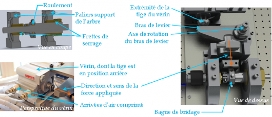 Le roulement est mis en rotation par l’intermédiaire de sa bague interne, alors que sa bague externe est fixe et en liaison avec la bague de bridage qui entoure le roulement et transmet la force radiale à ce dernier, par l’intermédiaire du capteur d’effort, du bras de levier et de l’extrémité de la tige du vérin.