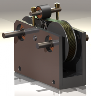 Cet assemblage de 2 poulies et d’une courroie crantée permet de démultiplier la vitesse de l’arbre secondaire, qui entraine le roulement, de l’arbre primaire de sortie du moteur. Ainsi en ayant une vitesse maximale de 2000 tr/min sur le secondaire, le primaire du moteur tourne à la vitesse nominale de ce dernier, permettant ainsi de délivrer potentiellement son couple nominal. |