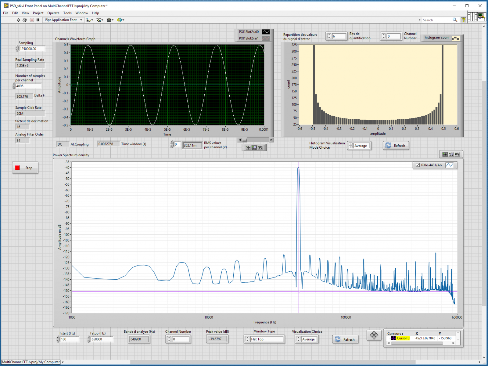 Les fonctionnalités présentes sur l'IHM ci-dessus sont en cours de développement sur le châssis PXIe doté de la carte FlexRIO PXIe-7975R avec pour objectif de pouvoir analyser des signaux parmi 4 entrées analogiques disponibles, et ce dans une bande inférieure à 10 Mhz. La fréquence d'échantillonnage est de 120 Mech/s pour chacune des 4 voies synchrones. L'utilisation du FPGA permet d'implémenter les calculs parallélisés de FFT et de multiplications complexes cadencées à l'aide d'une horloge de 920 Mhz de fréquence. Les filtres FIR seront intégrés dans la phase des perspectives.